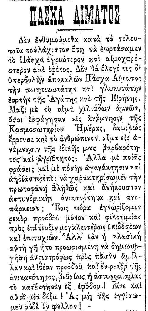 Ειδικά στην Ανάσταση και το Πάσχα του 1902, πριν εκατόν είκοσι χρόνια, οι χιλιάδες πυροβολισμοί, ο άγνωστος αριθμός βαρελότων και κάθε είδους εκρήξεων, οι συμπλοκές και τα μαχαιρώματα δίνουν στη χώρα εικόνα πολεμικού τοπίου εν εξελίξει, ή, όπως αναφέρει εφημερίδα: “Όψη στρατοπέδου ή τουλάχιστον λαού διατελούντος εις γενικήν επιστράτευσιν”.
