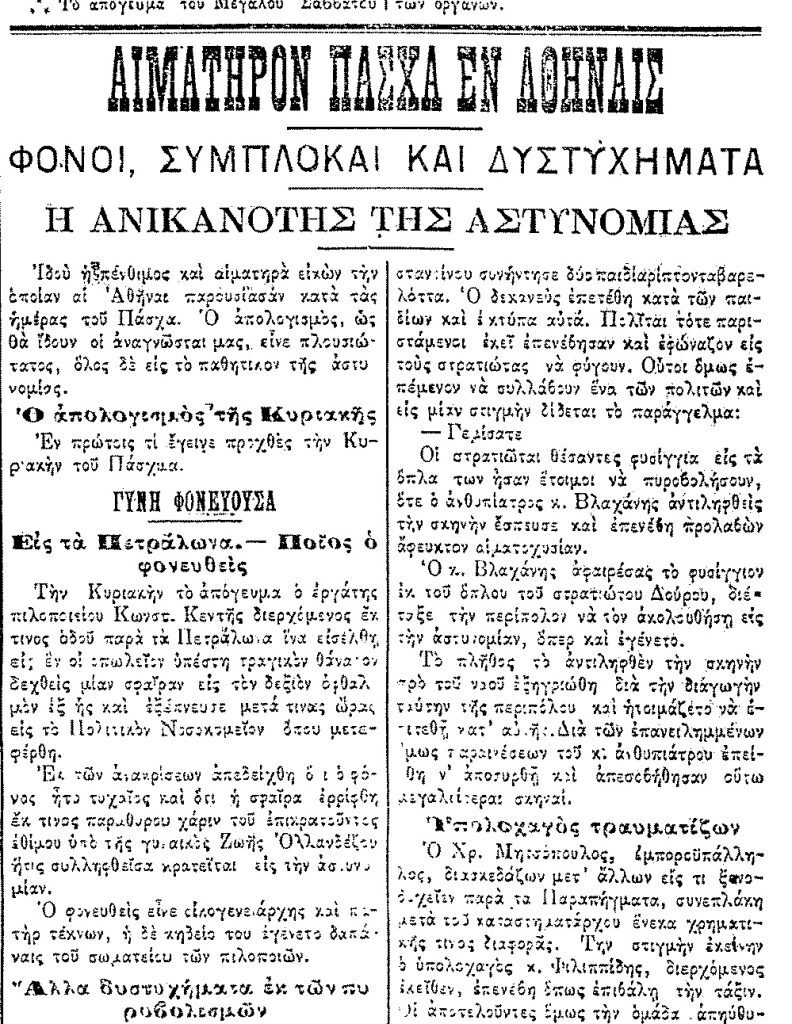 Την Κυριακή του Πάσχα ανοίγοντας την πόρτα για να μπει σε οινοπωλείο των Πετραλώνων οικογενειάρχης δέχεται σφαίρα στο δεξί του μάτι και εκπνέει λίγη ώρα μετά στο νοσοκομείο που μεταφέρεται. Αξίζει να σημειωθεί ότι θύτης είναι μια γυναίκα που διασκεδάζει εκείνη την ώρα στο μαγαζί. Η κηδεία του θύματος γίνεται με την οικονομική συνεισφορά του σωματείου των πιλοποιών.