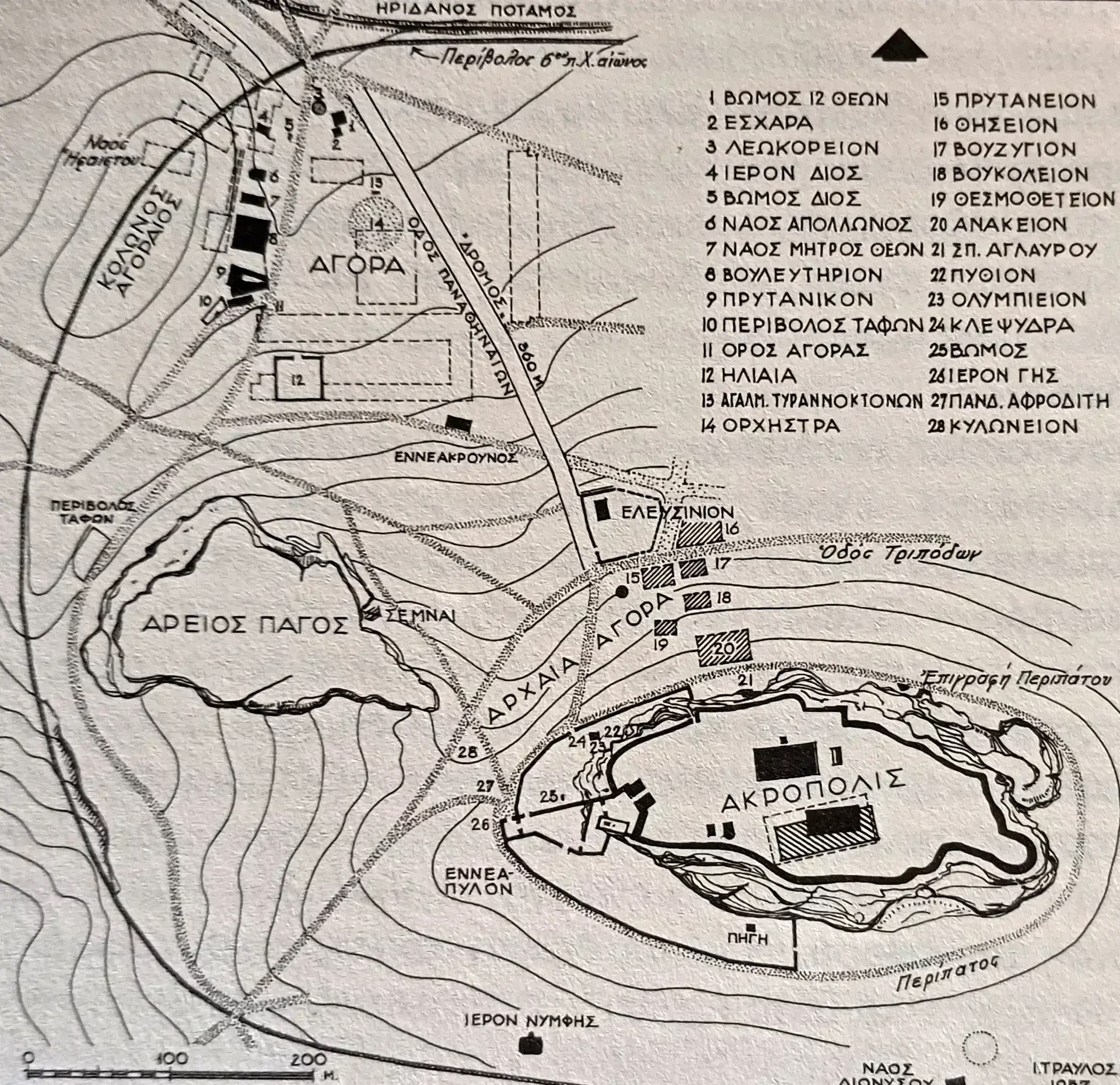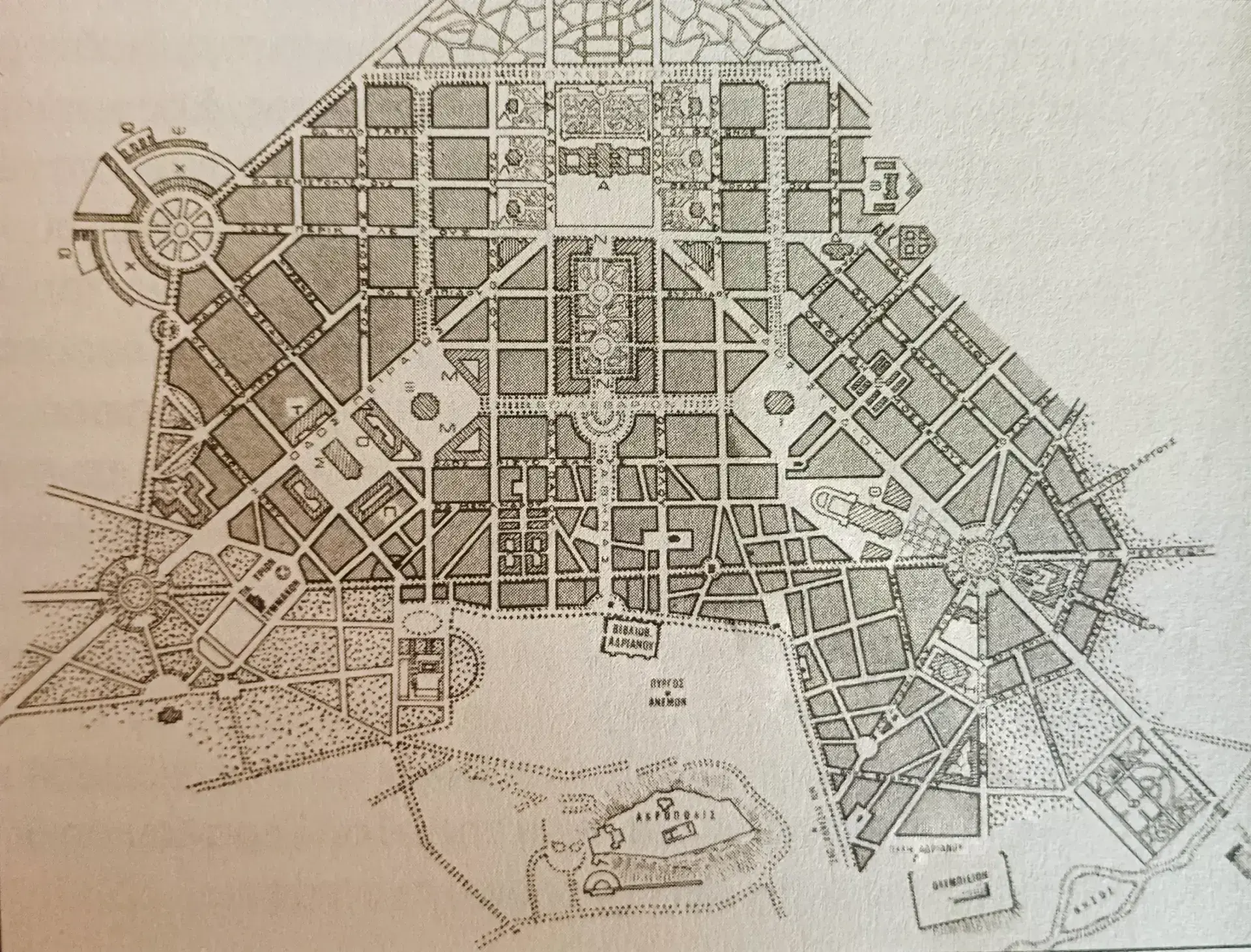 Μοιραία το νευραλγικότερο κομμάτι της Αθήνας χαράζεται και αναπτύσσεται ακτινωτά του βράχου. Η οδός Τριπόδων έχει κληροδοτηθεί από την αρχαιότητα και η επίσημη ονοματοθεσία της είναι θέμα τυπικό. Η Αδριανού που αποτελεί τον κύριο δρόμο της αγοράς παίρνει μεγάλη αξία.