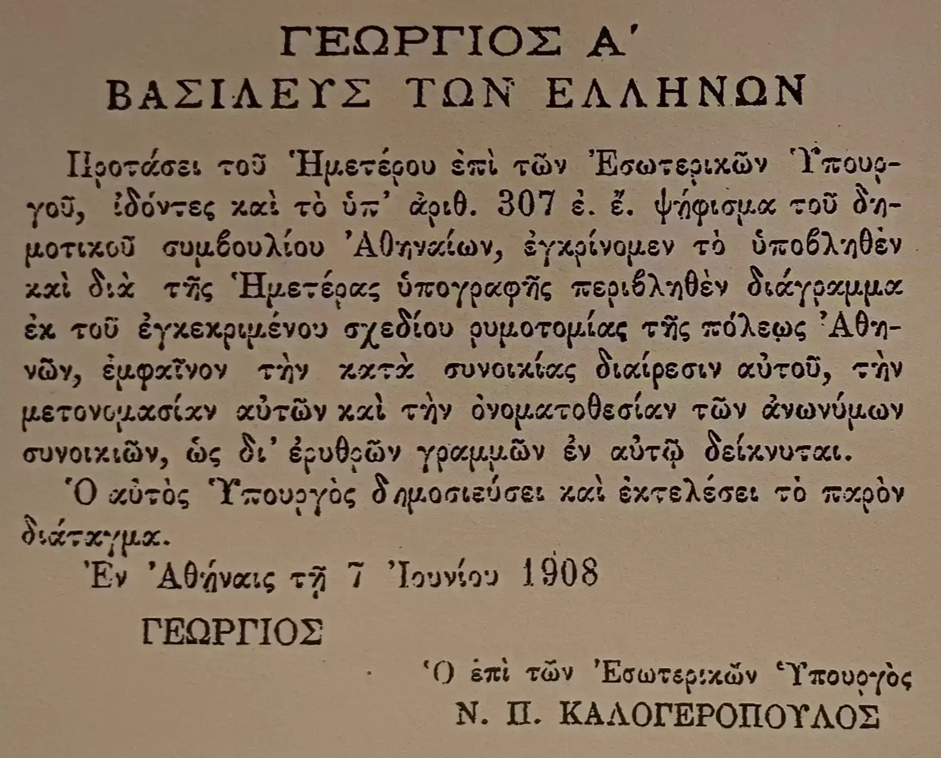 Η πρόταση των δύο επιστημόνων βρίσκει ευήκοα ώτα 20 χρόνια μετά (!) όταν στον δημαρχιακό θώκο βρίσκεται ο Σπυρίδων Μερκούρης, ο οποίος ασχολείται συστηματικά με τη ρυμοτομία της πόλης και την ονοματοθεσία και αρίθμηση των δρόμων της. Το 1905, Πολίτης και αυτή τη φορά Σπυρίδων Λάμπρος (αδελφός του Μιχαήλ), πρύτανης του Εθνικού Πανεπιστημίου, ενεργοποιούν την από ετών «παγωμένη» πρόταση για μετονομασία των δρόμων, που φέρουν κακόηχα ονόματα και φυσικά, για διαίρεση της πόλης σε πολλά τμήματα.