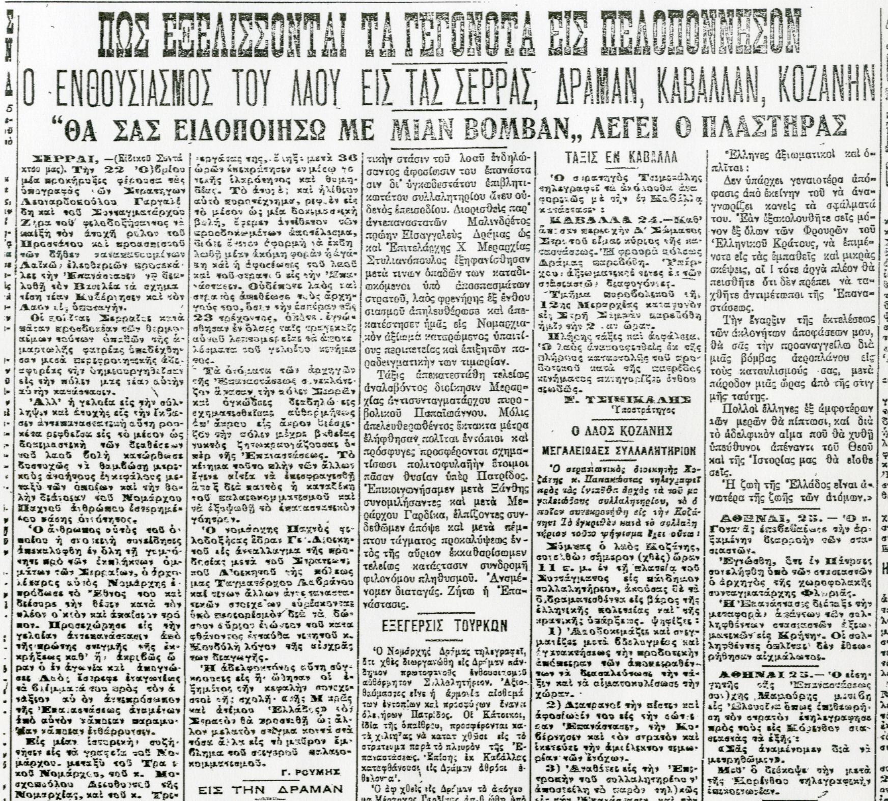 Το κίνημα Στρατού και Ναυτικού της 11ης Σεπτεμβρίου 1922 των Πλαστήρα, Γονατά και Φωκά παίρνει τα ηνία της χώρας, σχηματίζει πολιτική κυβέρνηση με πρωθυπουργό τον Σωτήριο Κροκιδά, αλλά ουσιαστικά η χώρα κυβερνάται από επαναστατική επιτροπή της οποίας ηγείται ο Νικόλαος Πλαστήρας.
