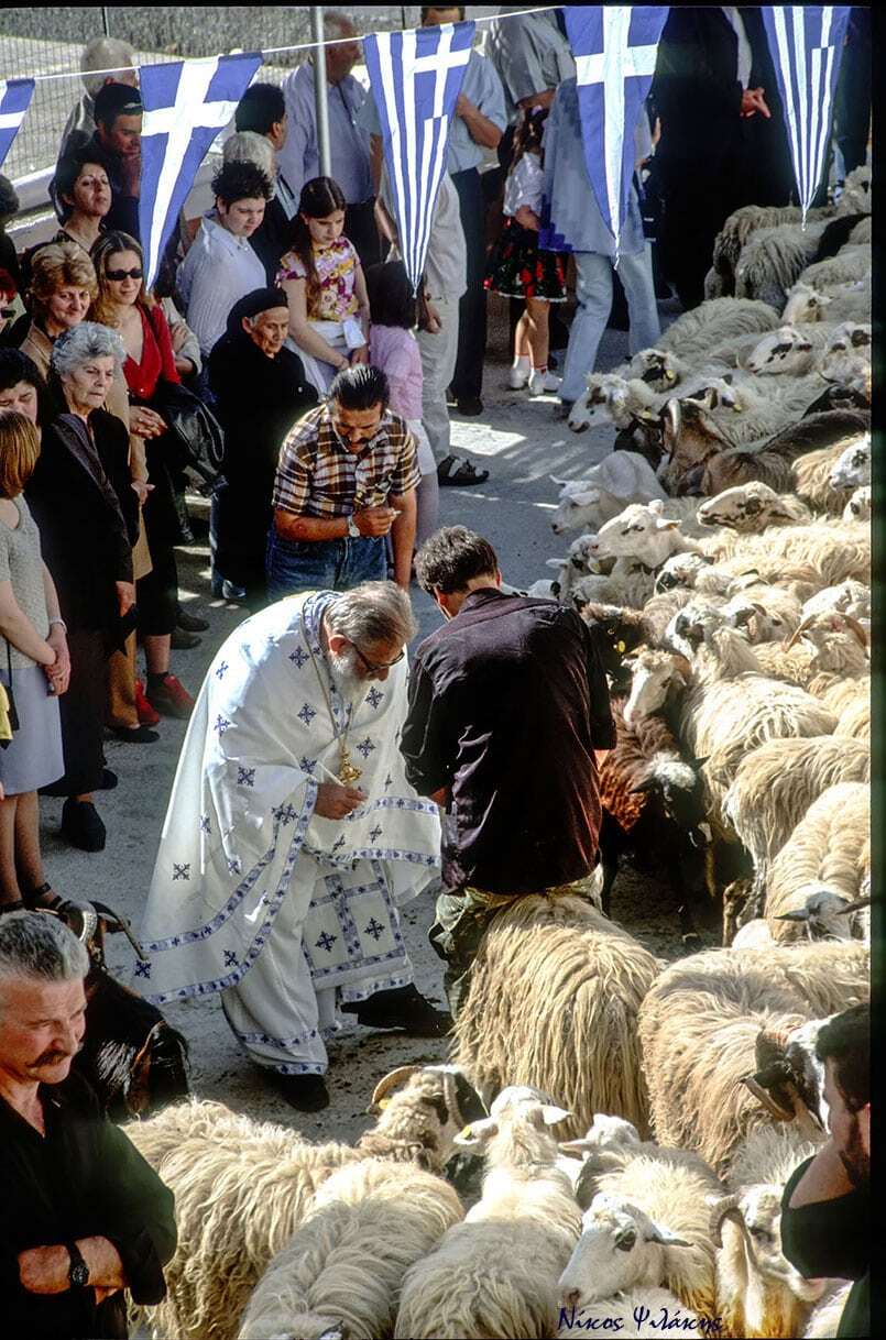 «Τον σεβασμό στη φύση και την αρμονική συνύπαρξή του με τον φυσικό κόσμο. Μέχρι και πριν από μισό αιώνα οι Κρήτες χρησιμοποιούσαν ακόμη το ησιόδειο άροτρο για να οργώνουν τη γη τους και είχαν συναίσθηση των δικών τους μικρών δυνάμεων σε σύγκριση με την παντοδυναμία της φύσης. Ο άνθρωπος της προβιομηχανικής εποχής δεν ένιωθε επικυρίαρχος αλλά κομμάτι του φυσικού κόσμου από τον οποίο εξαρτιόταν η επιβίωσή του. Αυτό ακριβώς δείχνουν τα έθιμα λαϊκής λατρείας, αυτό φανερώνουν και οι φωτογραφίες που αποτυπώνουν καθαγιασμούς του χώρου, τελετουργίες που επισφραγίζουν την ιερότητα των υδάτων, λιτανείες σε περιόδους παρατεταμένης ανομβρίας, εθιμικές απαρχές (προσφορές των πρώτων καρπών σε προστάτες αγίους), λατρεία σε σύγχρονα ιερά κορυφής και άλλα. Στις τελετουργίες καθαγιασμού του χώρου βλέπουμε ανθρώπους που κρατώντας τις εικόνες των αγίων και τα ιερά λάβαρά τους σχηματίζουν νοερούς προστατευτικούς κύκλους γύρω από γεωγραφικά όρια των κοινοτήτων τους. Σε άλλες φωτογραφίες βλέπουμε καθαρά τη σχέση των αγροτικών κοινωνιών με τα δέντρα, σχέση που προσλαμβάνει συχνά συμβολικές – τελετουργικές προεκτάσεις. Έχω δει ανθρώπους να αγκαλιάζουν τα δέντρα, να τα θυμιάζουν, να κρεμούν τάματα στα κλαδιά, να ανάβουν καντήλια στις ρίζες τους. Είναι τα δέντρα που ταυτίζονται με κάποιον άγιο της εκκλησίας και που ακόμη και οι σημερινοί προσκυνητές τα περιβάλλουν με σεβασμό. Και επειδή κάποιοι δεν θα κατανοήσουν το βαθύτερο νόημα αυτών των τελετουργικών πρακτικών, ίσως και να τα θεωρήσουν “ειδωλολατρικά”, θα τονίσω ότι στο επίκεντρο της λατρείας δεν βρίσκεται το δέντρο αλλά ό,τι αυτό εκφράζει, συμβολίζει και αντιπροσωπεύει. Αγία Μυρτιά, Δρυς της Αγίας Παρασκευής, Μηλίτσα του Τιμίου Σταυρού… Σε μια βουνοκορφή, εκεί όπου υπήρχε κάποτε μινωικό ιερό κορυφής και σήμερα είναι χτισμένο με ξερολιθιά το ξωκλήσι του Σταυρού, ο ιερέας μοιράζει μαζί με το αντίδωρο τους μικρούς καρπούς του ιερού δέντρου, κάτι σαν πολύ μικρά μήλα» ανέφερε ο κ. Ψιλάκης στο ΑΠΕ-ΜΠΕ, τονίζοντας ότι πολλά από τα έθιμα που έχει απαθανατίσει αυτά τα 40 χρόνια βρίσκονται σήμερα σε υποχώρηση και άλλα έχουν ήδη ξεχαστεί.