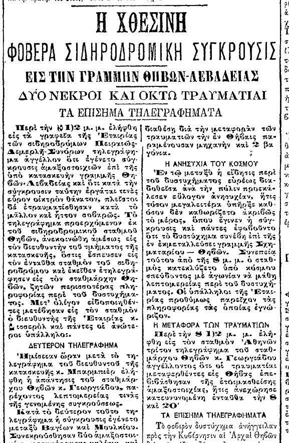 Στις 27 Απριλίου 1904 έχουμε σιδηροδρομικό ατύχημα στη γραμμή Θηβών-Λιβαδειάς πριν ακόμα αυτή δημιουργηθεί… Εκείνο το μεσημέρι μεταξύ των περιοχών Βαγίου και Μουλκίου 15 χιλιόμετρα έξω από τη Θήβα, συγκρούονται μετωπικά δύο αμαξοστοιχίες. Η μία επιστρέφει από τη Λιβαδειά και η δεύτερη κατευθύνεται εκεί μεταφέροντας άμμο για στρώσιμο της υπό κατασκευή γραμμής, η οποία προγραμματίζεται να δοθεί στη κυκλοφορία σε 15 ημέρες. Από τη σφοδρή σύγκρουση και την έκρηξη του λέβητα της ατμομηχανής, σκοτώνονται δύο εργάτες τραυματίζονται με βαριά εγκαύματα και ακρωτηριάζονται οκτώ, ένας εκ των οποίων είναι ο γιος του Γάλλου εργολάβου που χάνει το χέρι του.