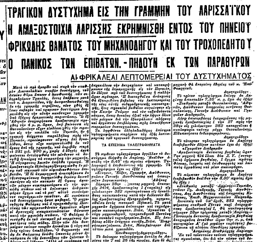 Το παιχνίδι της μοίρας θέλει το σιδηροδρομικό ατύχημα να συμβαίνει ακριβώς πριν 97 χρόνια στο ίδιο δίκτυο Αθηνών-Θεσσαλονίκης στη Θεσσαλία. Έχει προηγηθεί μάλιστα λίγες ημέρες πριν δυστύχημα στο σιδηροδρομικό σταθμό Λιανοκλαδίου στο οποίο χάνει τη ζωή του ο διευθυντής του σταθμού. Είναι ξημερώματα 1ης Μαρτίου 1926 όταν “εις την αυτήν κακότυχον γραμμήν” η αμαξοστοιχία Αθήνας- Θεσσαλονίκης βρίσκει στο διάβα της ένα τεράστιο βράχο.