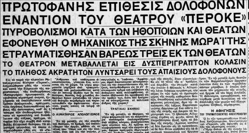 Ενώ η οργή των μπράβων ξεσπά πλέον σε σκηνικά και έπιπλα του θεάτρου, τα φαρμακεία της περιοχής γεμίζουν τραυματίες της επίθεσης και του τσαλαπατήματος στις εξόδους. Όταν στο “Περοκέ” φτάνει ισχυρή αστυνομική δύναμη συλλαμβάνει με το περίστροφο στο χέρι τον 28χρονο Ανδρέα Δικόδινιμο, που στη μεταφορά του στον τμήμα λυντσάρεται από τους συγκεντρωμένους έξω από το θέατρο. Ο βαριά χτυπημένος Μωραΐτης χάνει τη ζωή του λίγο πριν φτάσει στην Πολυκλινική, ενώ οι άλλοι τραυματίες νοσηλεύονται στο Πολιτικό Νοσοκομείο (νυν “Ελπίς”).
