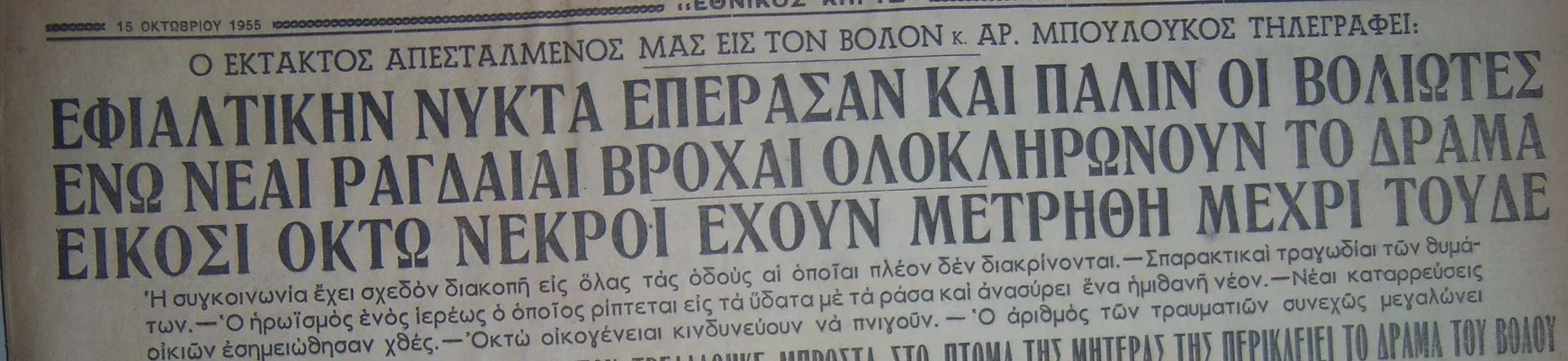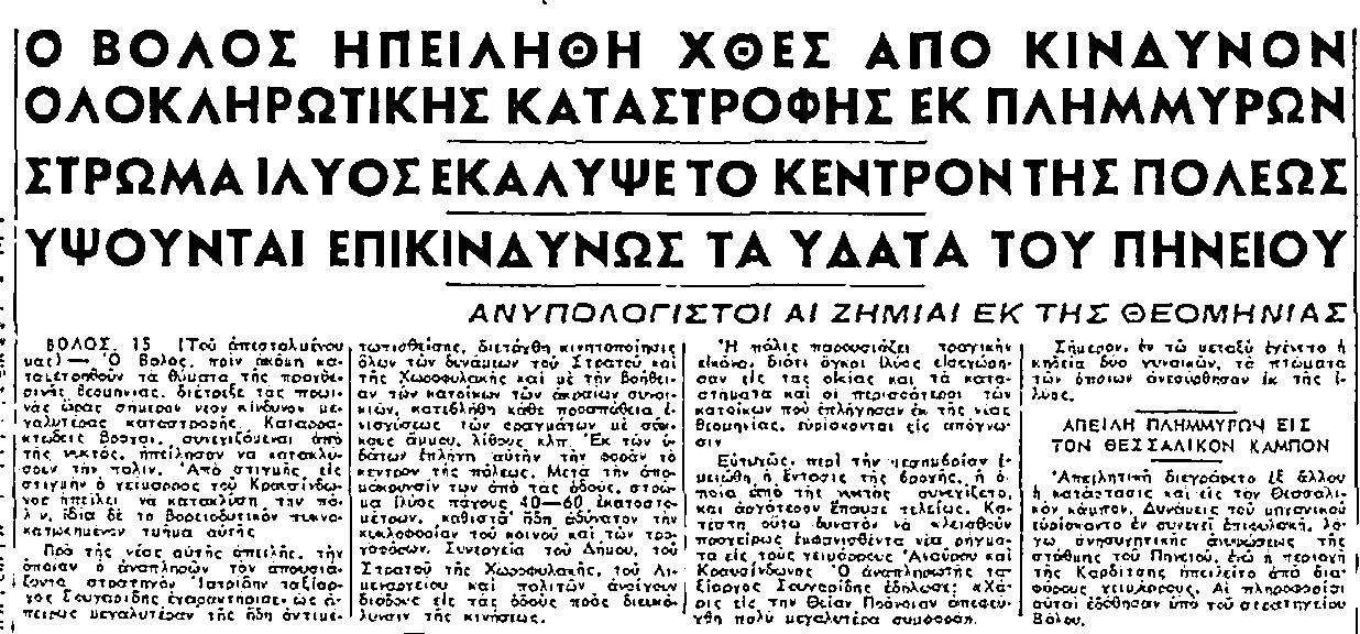 “Είναι αδύνατον να αποδοθούν εις απλάς περιγραφάς οι τραγικές στιγμές που περνούν το τελευταίον τριήμερον οι Βολιώτες. Πόνος συνέχει την ψυχήν των δια την καταστροφικήν μανίαν των στοιχείων της φύσεως που τους έπληξε”, αναφέρουν οι δημοσιογραφικές ανταποκρίσεις από την μαρτυρική πόλη. Τελικός απολογισμός της ανατριχιαστικής τραγωδίας δεν μπορεί να υπάρξει αφού υπάρχει σημαντικός αριθμός αγνοουμένων και για αρκετές ημέρες σωροί ξεβράζονται σε παραλίες. Τα επίσημα νούμερα μιλούν για τουλάχιστον 28 θύματα τα μικρότερα εκ των οποίων είναι δύο νεογέννητα μωρά 20 και 22 ημερών.