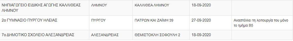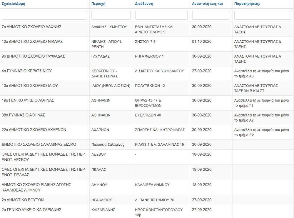Ο αριθμός των σχολείων με κρούσματα στην Αττική έχει αυξηθεί. Σύμφωνα με την ενημέρωση του υπουργείου Παιδείας τα σχολεία (ή τα τμήματα) που κλείνουν βρίσκονται στις εξής περιοχές: Δάφνη, Νίκαια, Γλυφάδα, Κερατσίνι, Ίλιον, Αχαρνές και Καισαριανή.