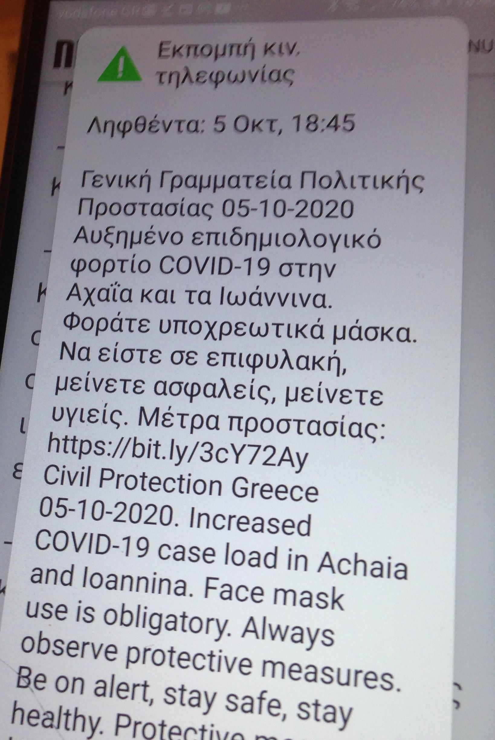 Όπως αναφέρεται στην ειδοποίηση έκτακτης ανάγκης, «αυξημένο επιδημιολογικό φορτίο Covid- 19 στην Αχαΐα» και συνεχίζει: «Φοράτε υποχρεωτικά μάσκα. Να είστε σε επιφυλακή. Μείνετε ασφαλείς, μείνετε υγιείς.»