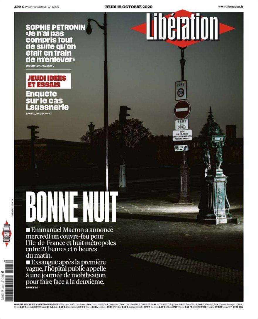 «Bonne nuit» (Καληνύχτα) είναι ο πρωτοσέλιδος τίτλος της γαλλικής εφημερίδας «Liberation» με την «πόλη του φωτός» να βυθίζεται στο σκοτάδι και να μην υπάρχει ψυχή στους δρόμους. Η γαλλική κυβέρνηση κήρυξε κατάσταση έκτακτης υγειονομικής ανάγκης στη χώρα, λόγω της επιδείνωσης της πανδημίας.