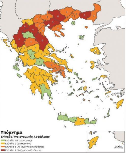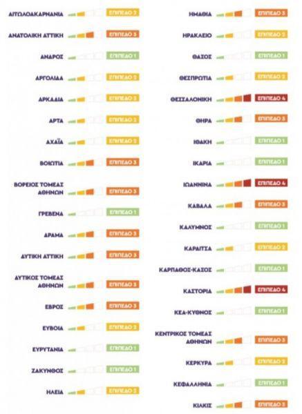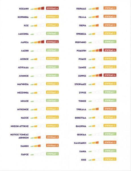 Επίσης, από την Παρασκευή στο επίπεδο 3 (πορτοκαλί) ανεβαίνουν εννιά περιφερειακές ενότητες. Πρόκειται για τις: Πέλλα, Δράμα, Έβρο, Ξάνθη, Κιλκίς, Πιερία, Ημαθία, Καβάλα, Χαλκιδική.