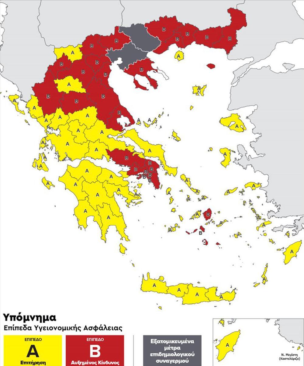 Τα μέτρα θα ισχύσουν σε κάθε περιοχή ανάλογα με το επίπεδο στο οποίο εντάσσεται, Α – επιτήρησης (κίτρινο) ή Β – αυξημένου κινδύνου (κόκκινο):