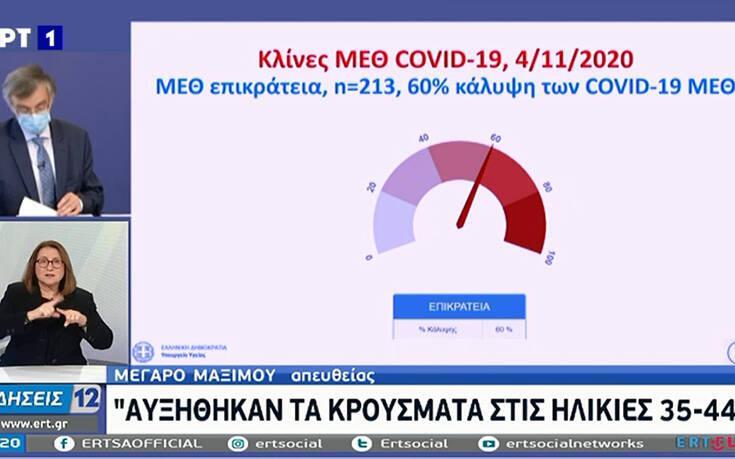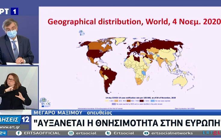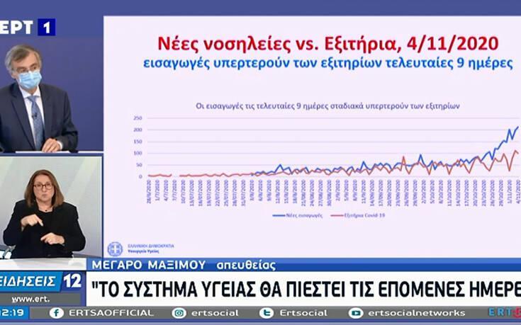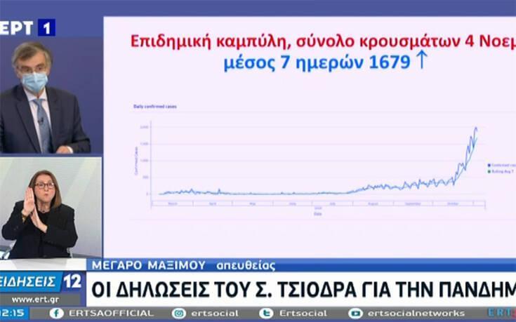 Ο Σωτήρης Τσιόδρας με την σειρά του έδειξε με διαφάνεια την αύξηση της επιδημικής καμπύλης αποδεικνύοντας την μεγάλη πίεση που δέχεται στο σύστημα υγείας αλλά και την διασπορά του ιού.
