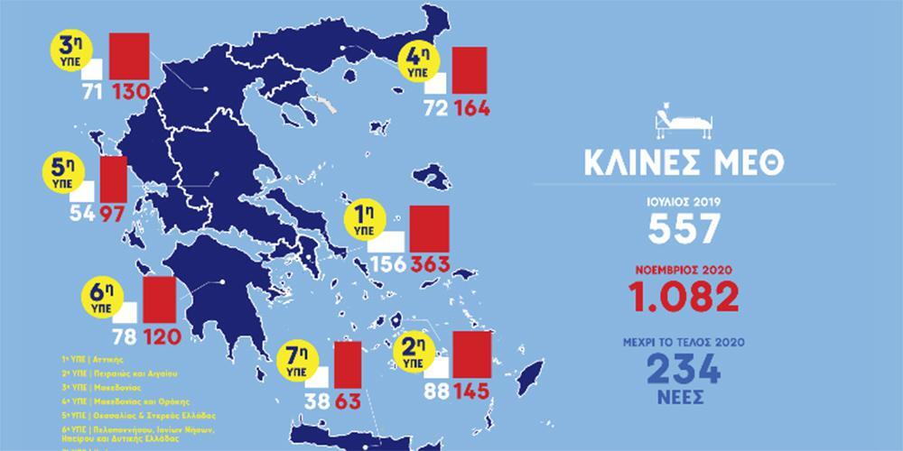 Εν συνεχεία, ο κ. Κικίλιας αναφέρθηκε στις διαθέσιμες κλίνες ΜΕΘ, επισημαίνοντας ότι τον Ιούνιο του 2019 υπήρχαν 557 κλίνες ΜΕΘ, ενώ μέχρι το τέλος του 2020 δημιουργούνται 234 νέες, με το σύνολο των διαθεσίμων κλινών να φτάνει τις 1.082.