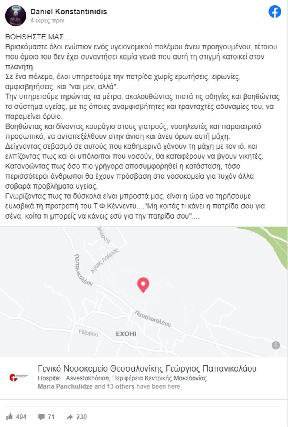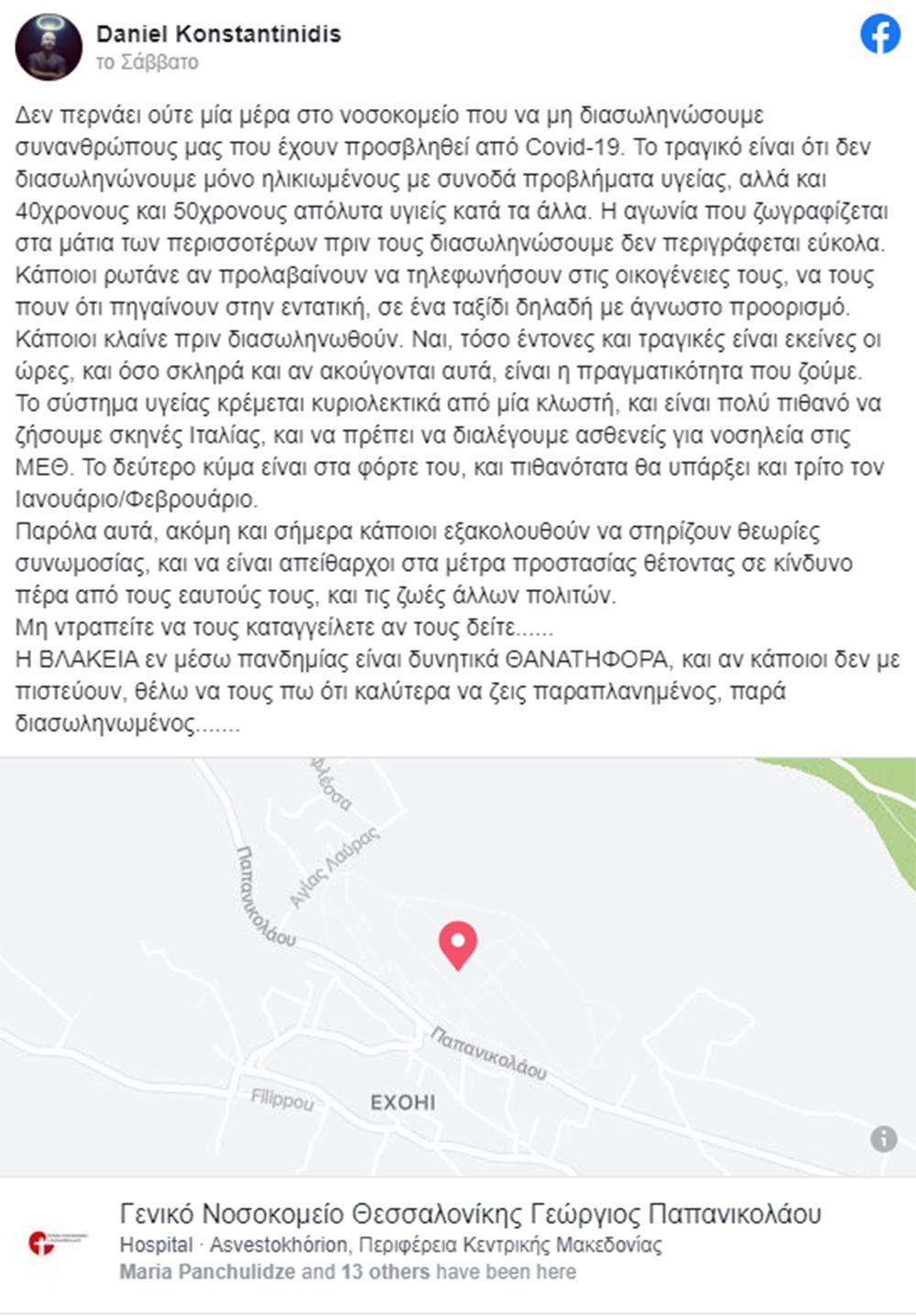 Στη δεύτερη ανάρτησή του πριν από λίγες ημέρες, ο Δανιήλ Κωνσταντινίδης ανέφερε: «Δεν περνάει ούτε μία μέρα στο νοσοκομείο που να μη διασωληνώσουμε συνανθρώπους μας που έχουν προσβληθεί από Covid-19. Το τραγικό είναι ότι δεν διασωληνώνουμε μόνο ηλικιωμένους με συνοδά προβλήματα υγείας, αλλά και 40χρονους και 50χρονους απόλυτα υγιείς κατά τα άλλα.