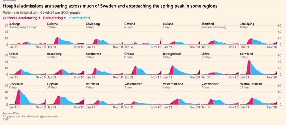 Ούτε όμως η Σουηδία δεν κατάφερε να γλιτώσει από τη σφοδρότητα του δεύτερου κύματος. Τα νέα κρούσματα και εισαγωγές ασθενών στα νοσοκομεία αυξάνονται ανησυχητικά, διαψεύδοντας τις προσδοκίες του επιτελείου Υγείας ότι η light, αντι-lockdown προσέγγιση θα ήταν αρκετή για να συγκρατηθεί η διασπορά της νόσου Covid-19.