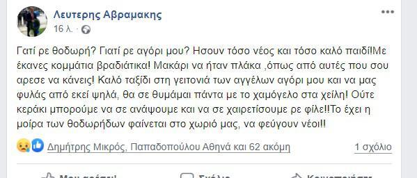 Την τραγική είδηση ανακοίνωσε μέσω Facebook o βουλευτής Σερρών του ΣΥΡΙΖΑ, Λευτέρης Αβραμάκης. «Γιατί ρε Θοδωρή? Γιατί ρε αγόρι μου? Ήσουν τόσο νέος και τόσο καλό παιδί! Με έκανες κομμάτια βραδιάτικα! Μακάρι να ήταν πλάκα, όπως από αυτές που σου άρεσε να κάνεις! Καλό ταξίδι στη γειτονιά των αγγέλων αγόρι μου και να μας φυλάς από εκεί ψηλά, θα σε θυμάμαι πάντα με το χαμόγελο στα χείλη! Ούτε κεράκι μπορούμε να σε ανάψουμε και να σε χαιρετίσουμε ρε φίλε!! Το έχει η μοίρα των Θοδωρήδων φαίνεται στο χωριό μας, να φεύγουν νέοι!!», έγραψε.
