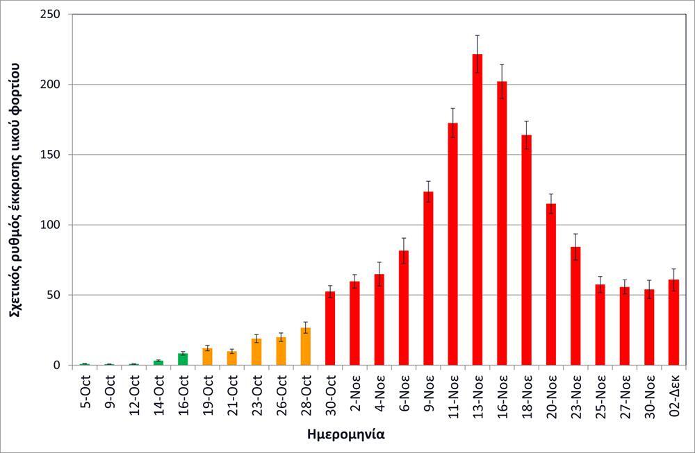 Στο διάγραμμα, που δημοσιεύει το ΑΠΕ-ΜΠΕ, οι ημέρες των δειγματοληψιών, που καταγράφονται με κόκκινο χρώμα αντιστοιχούν σε περισσότερα από 500 κρούσματα – όπως ανακοινώθηκαν τις αντίστοιχες ημέρες από τον ΕΟΔΥ – οι μέρες που καταγράφονται με πορτοκαλί σε 100-400 κρούσματα και οι μέρες που καταγράφονται με πράσινο σε λιγότερα από εκατό κρούσματα.