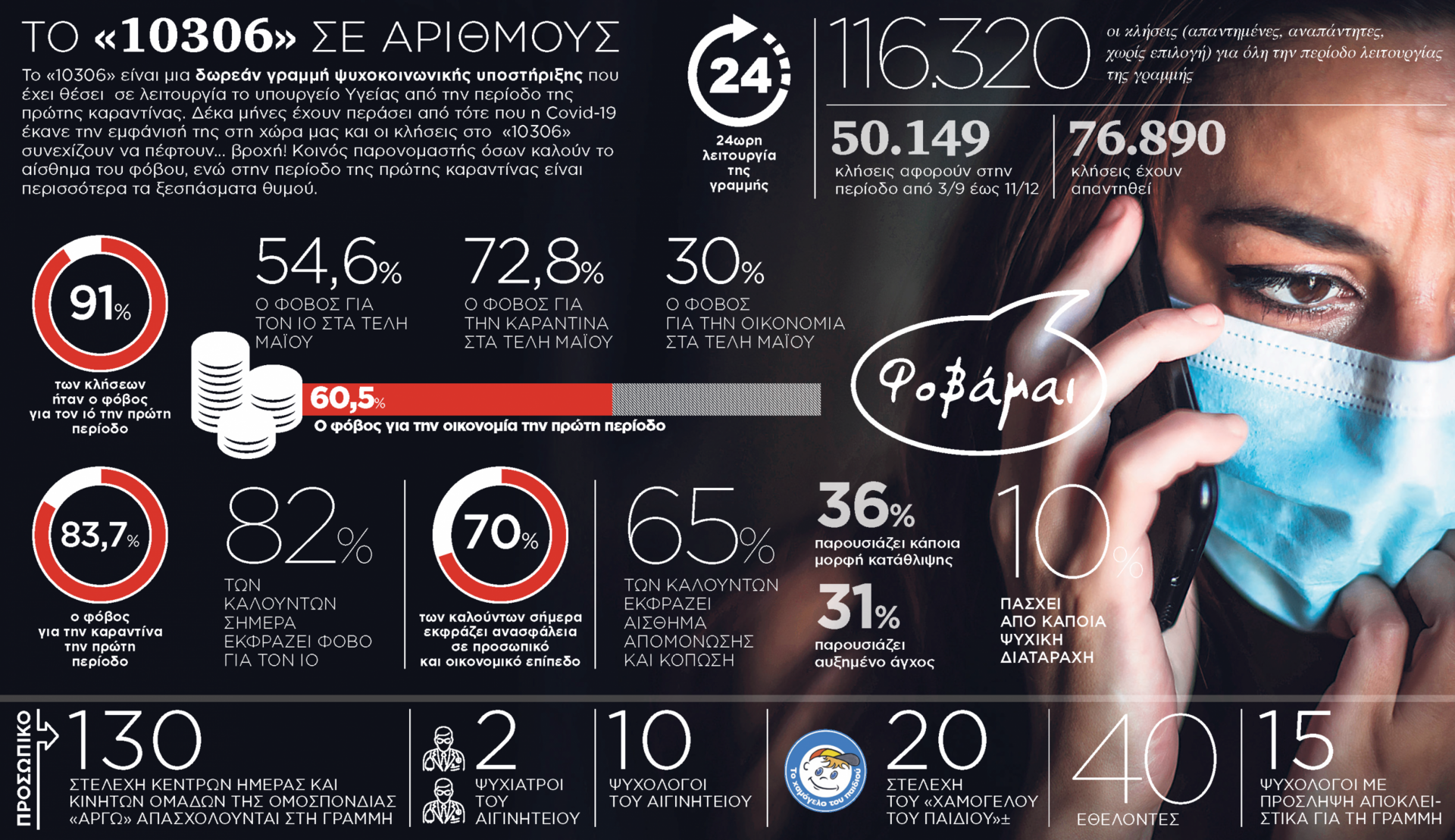 Το κυρίαρχο συναίσθημα που κυριαρχεί αυτήν την περίοδο, και αφού καταγράφεται τεράστια κόπωση του κόσμου, είναι ο φόβος τού «τι θα γίνει εάν συμβεί και σ’ εμένα;». Παράλληλα, έντονη είναι η λύπη για τους δεκάδες θανάτους που ανακοινώνονται καθημερινά. Δύο ψυχολόγοι, που ακούν τις ανησυχίες των Ελλήνων από την αρχή της λειτουργίας του «10306», ξεδιπλώνουν στον «Ε.Τ.» της Κυριακής την επιρροή της Covid-19 στον ψυχισμό τους.