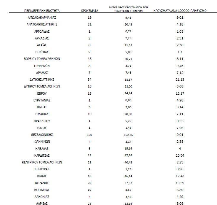 Η κατανομή των 573 νέων εγχώριων κρουσμάτων ανά Περιφερειακή Ενότητα παρουσιάζεται στον κατωτέρω πίνακα.