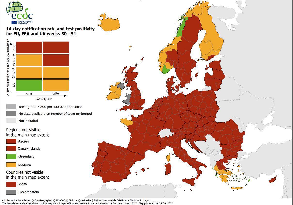 Αντίθετα, στο «πράσινο» συγκαταλέγονται τα Δωδεκάνησα, τα Επτάνησα και οι Κυκλάδες, με λιγότερα από 25 κρούσματα ανά 100.000 κατοίκους.