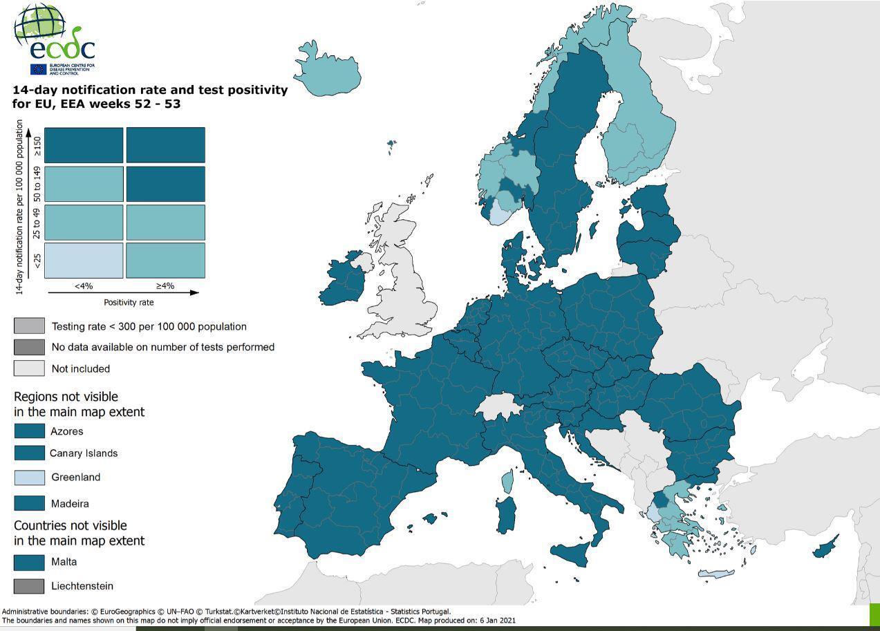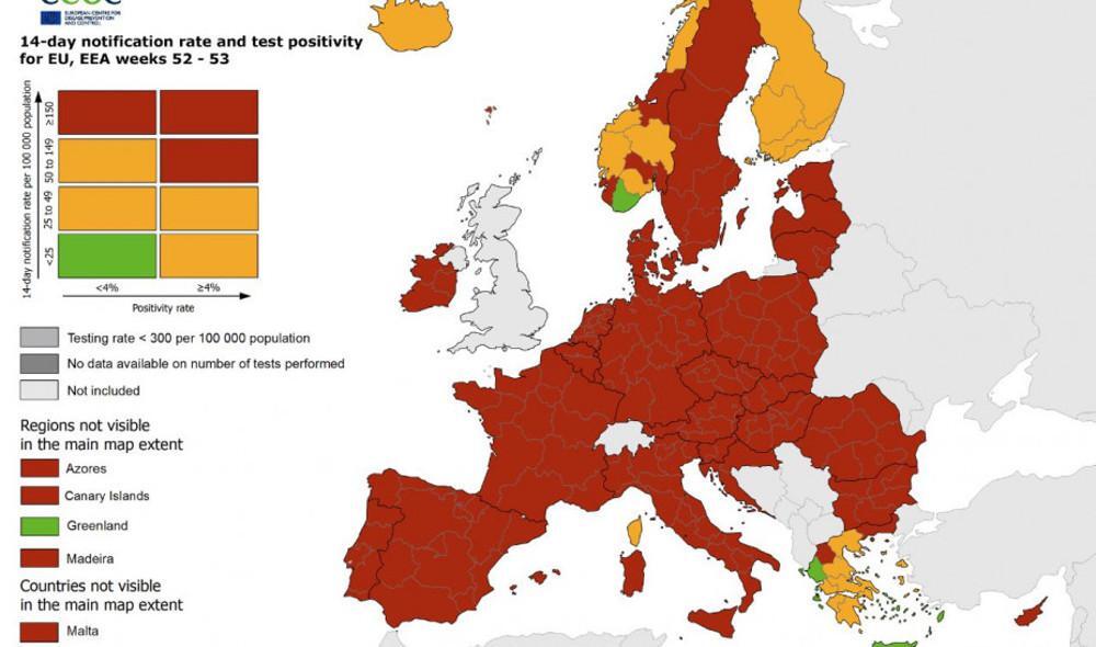 Όλη η υπόλοιπη Ευρώπη βρίσκεται στο «κόκκινο», δηλαδή καταγράφονται πάνω από 150 κρούσματα ανά 100.000 πληθυσμού. Να σημειωθεί ότι το ECDC δεν συλλέγει στοιχεία για τη Βρετανία, την Ελβετία, τις βαλκανικές χώρες (εκτός εκείνων που είναι μέλη της ΕΕ), την Ουκρανία, τη Λευκορωσία και τη Ρωσία.