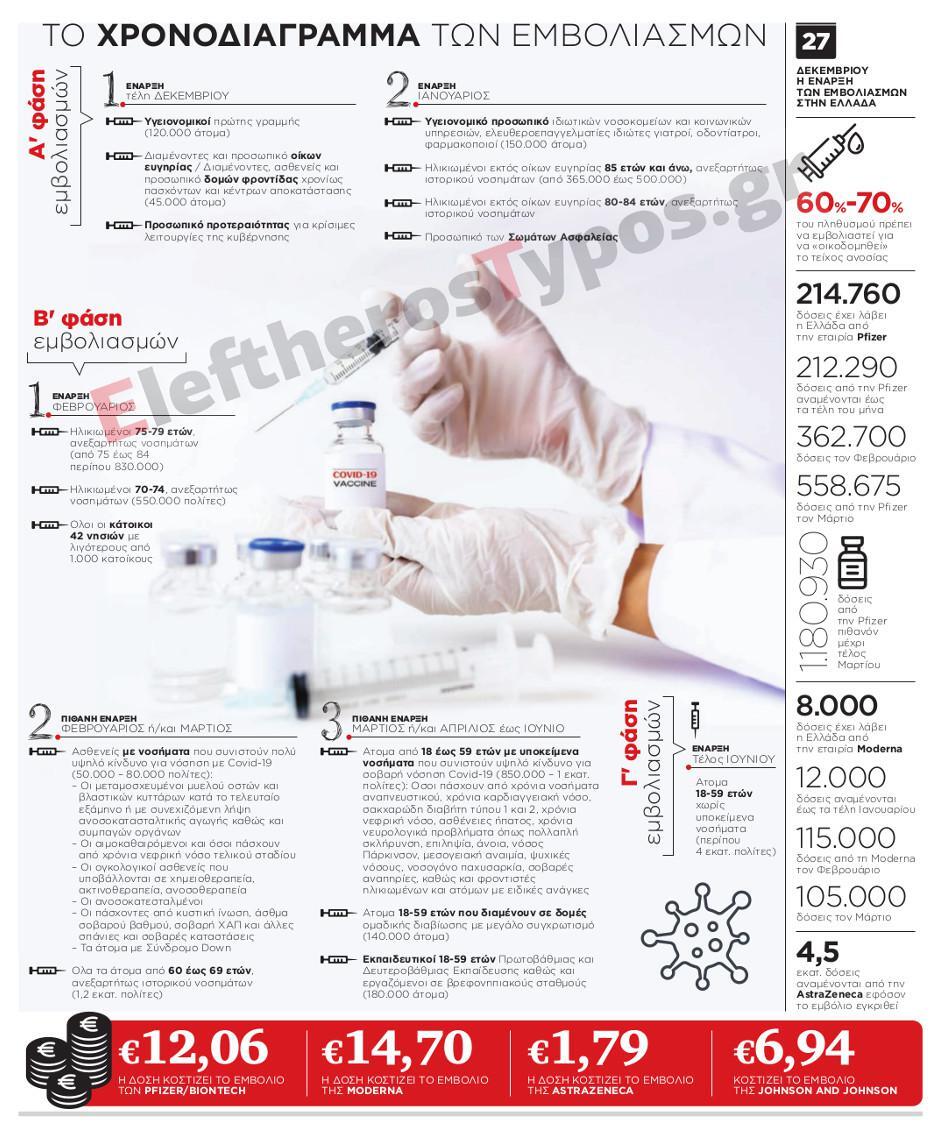 Η Εθνική Επιτροπή Εμβολιασμών έχει καταρτίσει ένα αναλυτικό σχέδιο προτεραιοποίησης του πληθυσμού που θα εμβολιαστεί, το οποίο δεν έχει βγει ακόμη στο φως της δημοσιότητας, καθώς συνεχώς προστίθενται ή αλλάζουν λεπτομέρειες. Το ακριβές χρονοδιάγραμμα για την έναρξη και την ολοκλήρωση του εμβολιασμού για καθεμία ομάδα ή υποομάδα του πληθυσμού δεν μπορεί να προβλεφθεί με ακρίβεια, καθώς εξαρτάται όχι μόνο από τις δόσεις που παραδίδονται στην Ελλάδα αλλά και από το ποσοστό συμμετοχής του πληθυσμού, κάτι που δεν είναι εκ των προτέρων γνωστό για τον γενικό πληθυσμό.