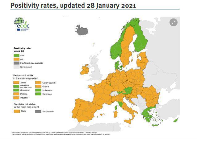 Η Ήπειρος, τα νησιά του Ιονίου, οι Κυκλάδες και τα Δωδεκάνησα είναι οι μόνες «πράσινες» περιοχές σε ολόκληρη την Ευρώπη, στον χάρτη που αφορά το συνδυαστικό δείκτη τεστ, νέων κρουσμάτων και δείκτη θετικότητας για την περίοδο 15-28 Ιανουαρίου.