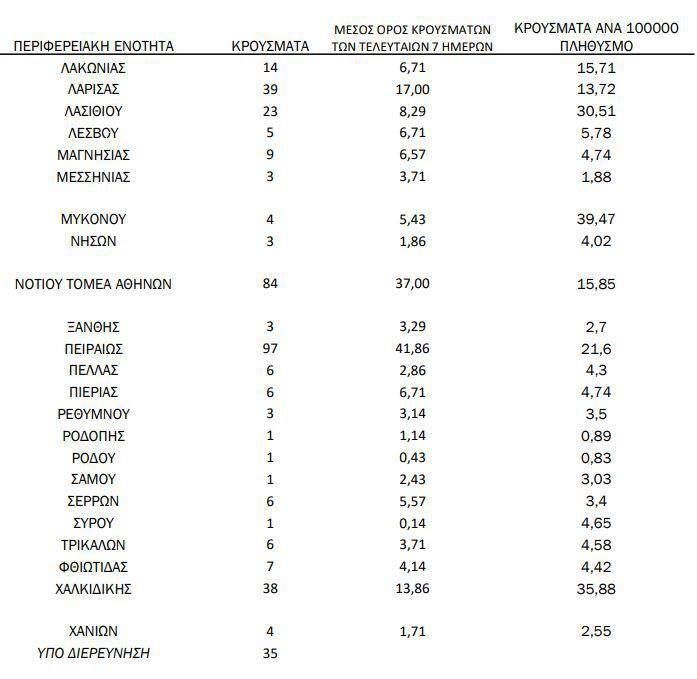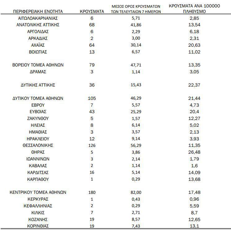 Σήμερα ανακοινώθηκαν 1261 νέα κρούσματα της λοίμωξης του νέου κορωνοϊού (COVID-19), εκ των οποίων 18 εντοπίστηκαν κατόπιν ελέγχων στις πύλες εισόδου της χώρας. Ο συνολικός αριθμός των κρουσμάτων ανέρχεται στα 158.716, εκ των οποίων 52.0% άνδρες. Κατά την ιχνηλάτιση βρέθηκε ότι 5988 (3.8%) θεωρούνται σχετιζόμενα με ταξίδι από το εξωτερικό και 49885 (63.9%) είναι σχετιζόμενα με ήδη γνωστό κρούσμα.
