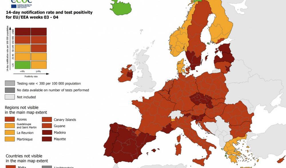 Στον χάρτη, που παρουσιάζει συνδυαστικά τα παραπάνω δεδομένα από την πανδημία του κορωνοϊού τις τελευταίες δύο εβδομάδες και ο οποίος ανανεώθηκε σήμερα, η Ελλάδα φαίνεται να εμφανίζει καλύτερη εικόνα από το σύνολο των υπόλοιπων ευρωπαϊκών κρατών, αν και ωστόσο προκύπτει ότι και η Ήπειρος έγινε από πράσινη περιοχή, κίτρινη. Με «πράσινο» (δηλαδή, ποσοστό θετικότητας μικρότερο του 4% και αριθμός νέων κρουσμάτων μικρότερος των 25 ανά 100.000 πληθυσμού) αποτυπώνονται μόνο τα νησιά του Ιονίου. Πράσινη επίσης είναι μία βόρεια περιοχή της Νορβηγίας και η Ισλανδία.