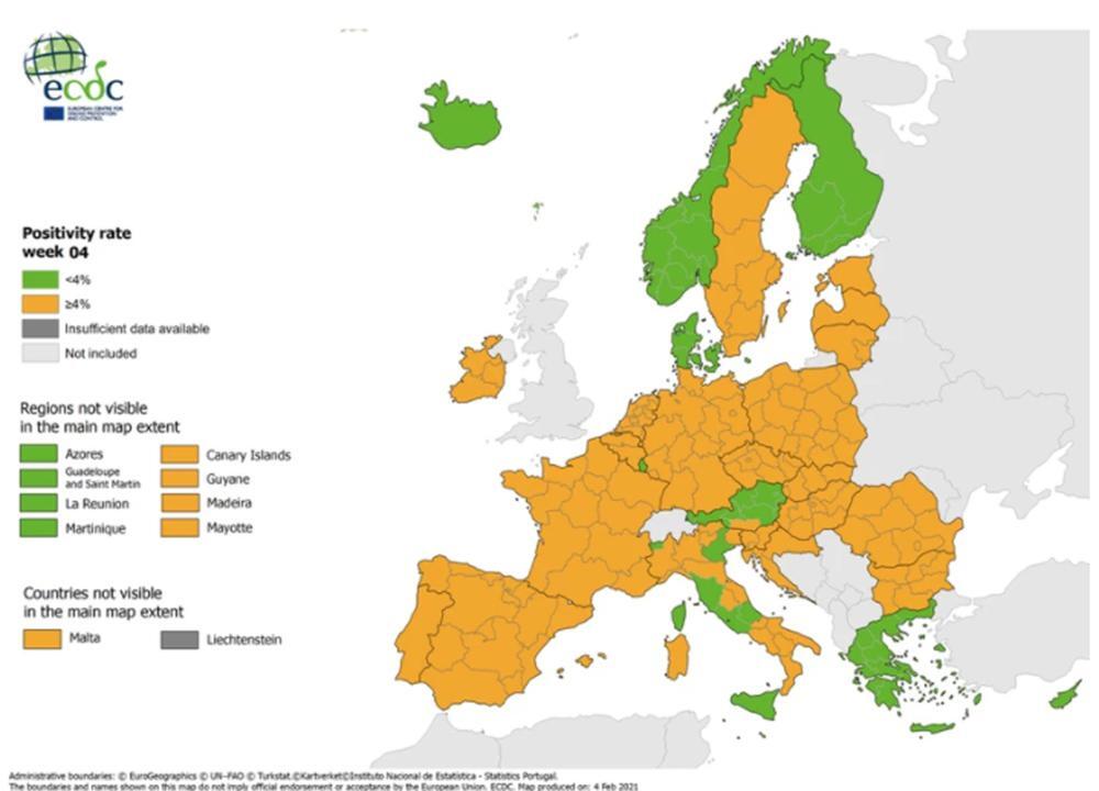 Στο «πράσινο» βρίσκεται ολόκληρη η Ελλάδα όσον αφορά τον χάρτη με το δείκτη θετικότητας, με το μεγαλύτερο μέρος της Ευρώπης να παραμένει στο «κίτρινο».