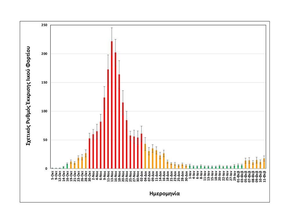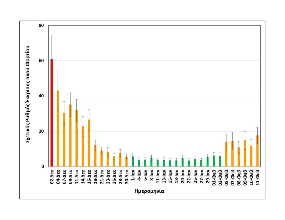Συγκεκριμένα, η μέση τιμή των μετρήσεων της Τετάρτης 10/2 και της Πέμπτης 11/2 είναι αυξημένη κατά περίπου 15% σε σύγκριση με τη μέση τιμή της Δευτέρας 8/2 και Τρίτης 9/2 και όπως φαίνεται στο διάγραμμα που παρουσιάζει το ΑΠΕ-ΜΠΕ το ιικό φορτίο είναι στα επίπεδα που βρισκόταν μεταξύ 26 και 28 Οκτωβρίου, πριν τη μεγάλη επιδημιολογική έξαρση.