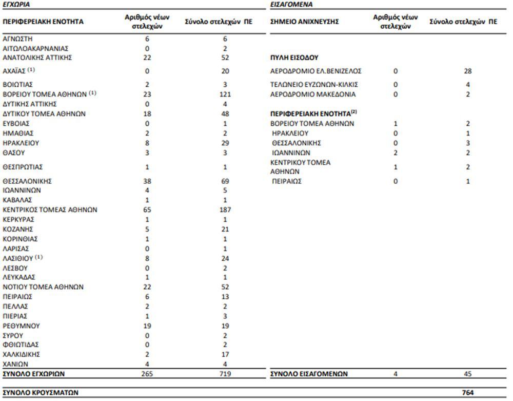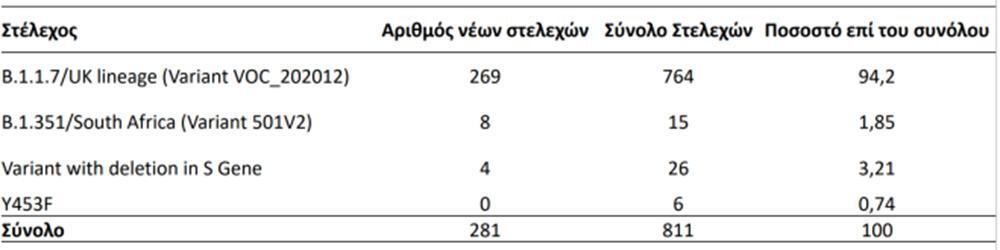 Συνολικά έχουν ταυτοποιηθεί 764 θετικά για την παρουσία μετάλλαξηςΒ.1.1.7/UKlineage (Variant VOC_202012) και 15 θετικά για την παρουσία μετάλλαξης B.1.351/South Africa (Variant 501V2) από την έναρξη λειτουργίας του Εθνικού Δικτύου Γονιδιωματικής Επιτήρησης για τις μεταλλάξεις του SARS-CoV-2 έως σήμερα.