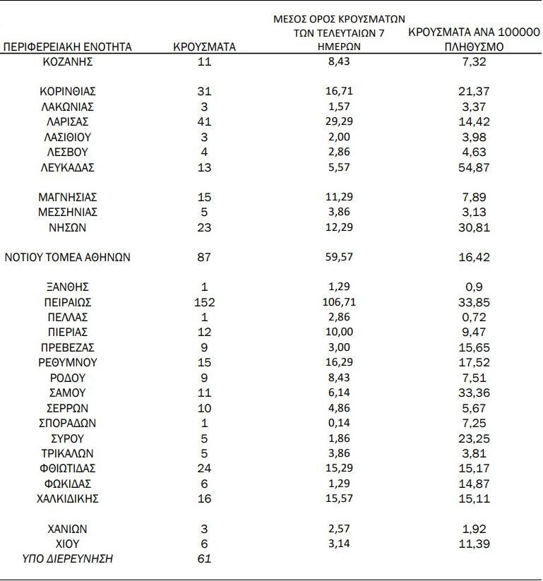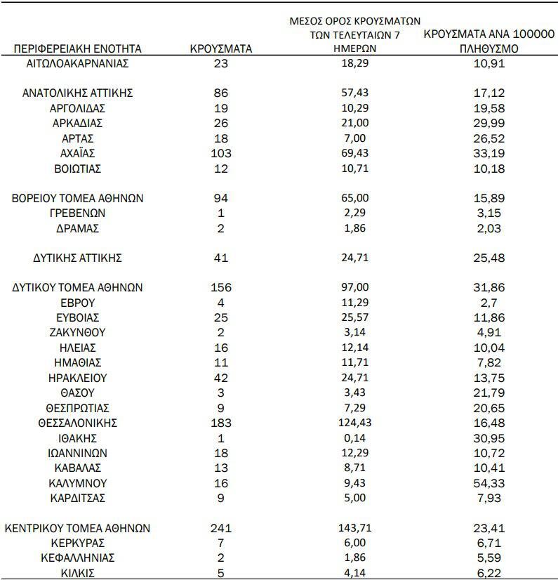 Δείτε αναλυτικά την κατανομή των κρουσμάτων ανά περιφέρεια, σύμφωνα με τα στοιχεία του ΕΟΔΥ: