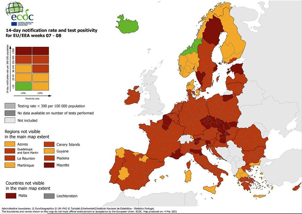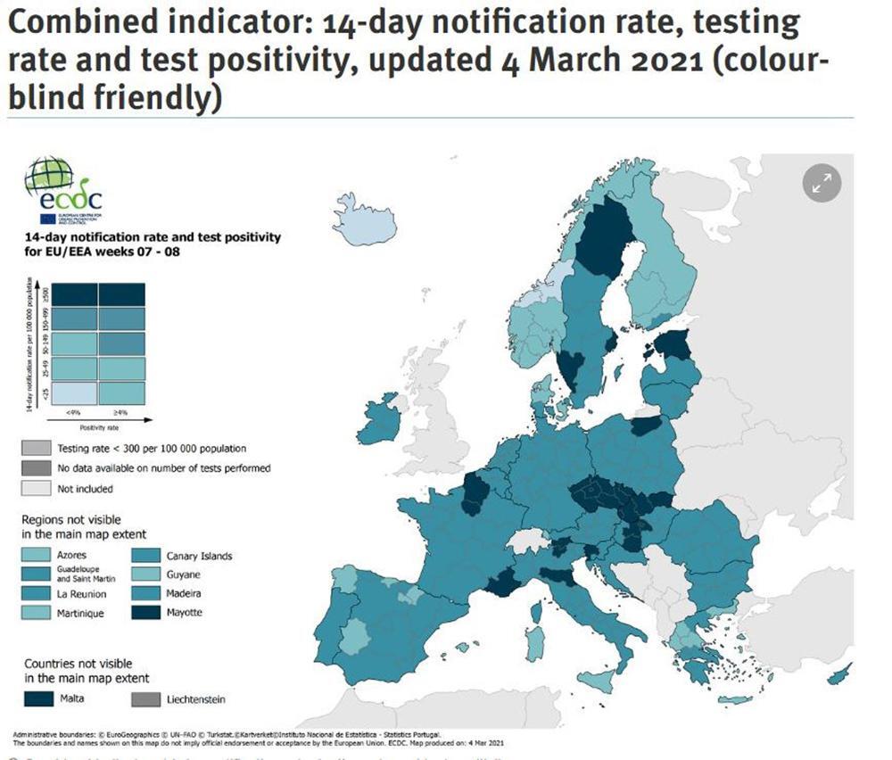 Υπενθυμίζεται ότι οι χάρτες του ECDC ανανεώνονται κάθε Πέμπτη, σύμφωνα με τη Σύσταση του Ευρωπαϊκού Συμβουλίου που έχει ως στόχο την εφαρμογή μιας συντονισμένης προσέγγισης μεταξύ των χωρών της ΕΕ όσον αφορά τον περιορισμό της ελεύθερης κυκλοφορίας για την αντιμετώπιση της πανδημίας. Το ECDC δεν συλλέγει στοιχεία για το Ηνωμένο Βασίλειο, την Ελβετία, τις βαλκανικές χώρες (εκτός εκείνων που ανήκουν στην Ε.Ε.), την Ουκρανία, τη Λευκορωσία και τη Ρωσία.