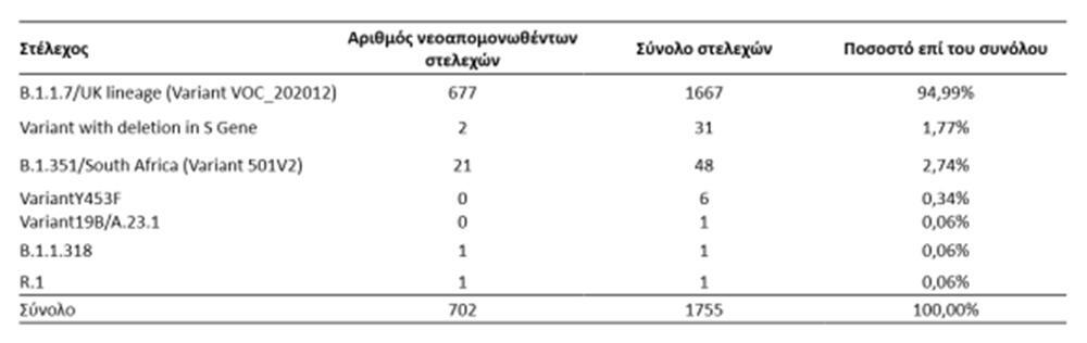 Από τα 702 στελέχη, τα 677 βρέθηκαν με τη μετάλλαξη Β.1.1.7/UK lineage (Variant VOC_202012) και 21 στελέχη βρέθηκαν με τη μετάλλαξη Lineage B.1.351/South Africa (Variant 501V2).