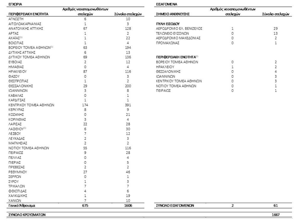 Τα δείγματα προέρχονται από τις Περιφέρειες Κεντρικής Μακεδονίας, Ηπείρου, Ιονίων Νήσων, Θεσσαλίας, Κρήτης, Αττικής και τις Περιφερειακές Ενότητες Φθιώτιδας, Βοιωτίας, Εύβοιας, Κορινθίας, Αιτωλοακαρνανίας, Αχαΐας, Μυτιλήνης και Σύρου. Από τον έλεγχο των 944 δειγμάτων, αναδείχθηκαν συνολικά 702 στελέχη με μεταλλάξεις ειδικού ενδιαφέροντος (variants of concern).