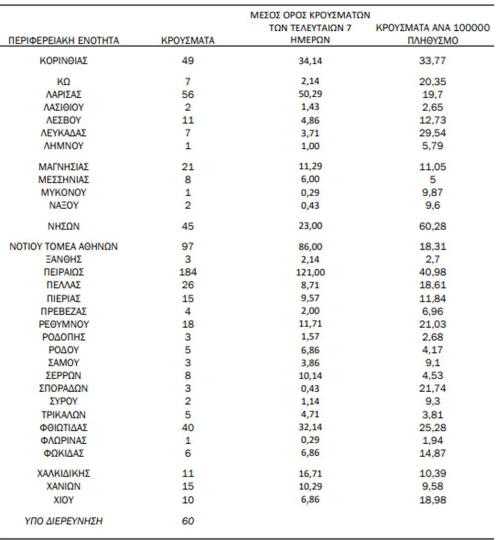 Με βάση τα επιβεβαιωμένα κρούσματα των τελευταίων 7 ημερών, 71 θεωρούνται σχετιζόμενα με ταξίδι από το εξωτερικό και 2.885 είναι σχετιζόμενα με ήδη γνωστό κρούσμα.