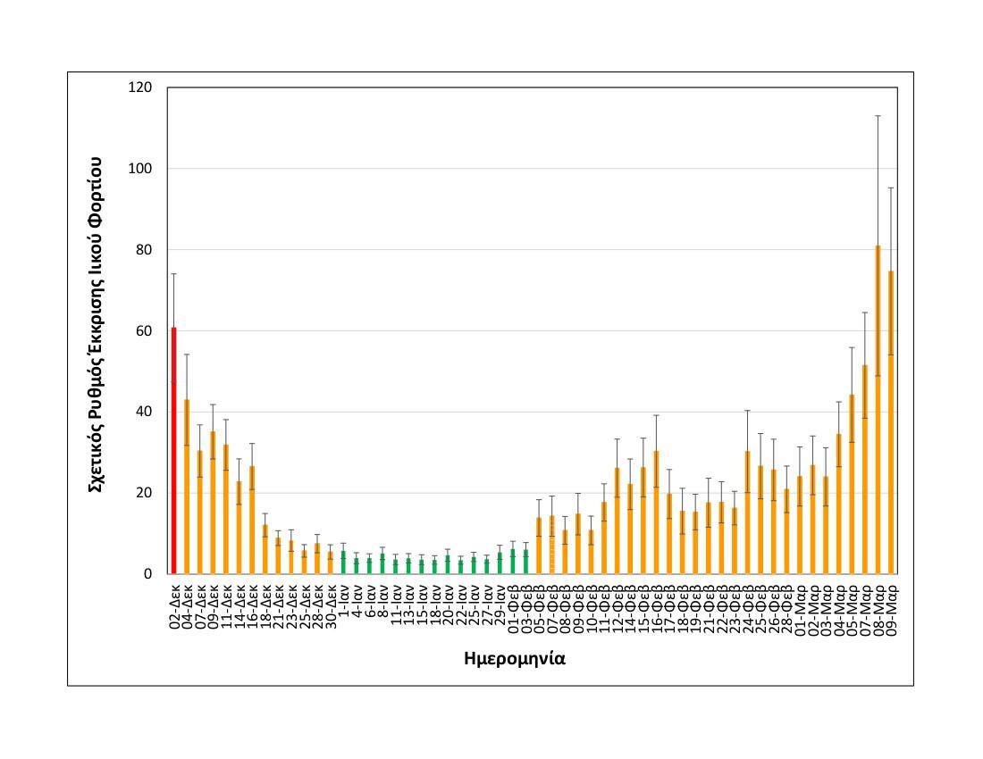 – αυξημένη κατά 63% σε σχέση με τη μέση τιμή των δύο αμέσως προηγούμενων μετρήσεων, δηλαδή της Παρασκευής 5/3 και της Κυριακής 7/3,