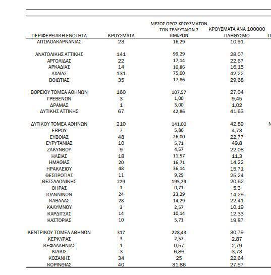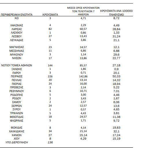 Τα νέα εργαστηριακά επιβεβαιωμένα κρούσματα της νόσου που καταγράφηκαν τις τελευταίες 24 ώρες είναι 2.570, εκ των οποίων 7 εντοπίστηκαν κατόπιν ελέγχων στις πύλες εισόδου της χώρας. Ο συνολικός αριθμός των κρουσμάτων ανέρχεται σε 214.661 (ημερήσια μεταβολή +1.2%), εκ των οποίων 51.6% άνδρες. Με βάση τα επιβεβαιωμένα κρούσματα των τελευταίων 7 ημερών, 65 θεωρούνται σχετιζόμενα με ταξίδι από το εξωτερικό και 1.843 είναι σχετιζόμενα με ήδη γνωστό κρούσμα.