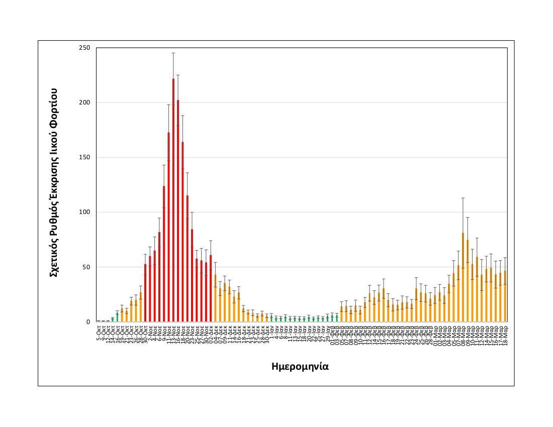 Συγκεκριμένα, σύμφωνα με την εξέλιξη των μετρήσεων από δείγματα που λαμβάνονται καθημερινά στην είσοδο της Εγκατάστασης Επεξεργασίας Λυμάτων Θεσσαλονίκης, αναφορικά με τις εξορθολογισμένες τιμές σχετικής έκκρισης ιικού φορτίου: