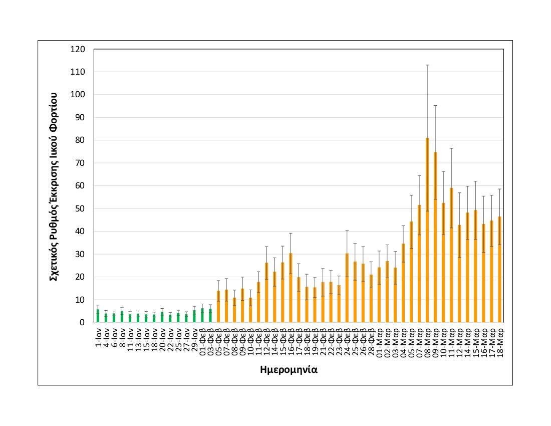 – Σταθερή (αύξηση μόλις 3%) σε σχέση με τη μέση τιμή των δύο αμέσως προηγούμενων μετρήσεων, δηλαδή της Δευτέρας 15/3 και της Τρίτης 16/3.