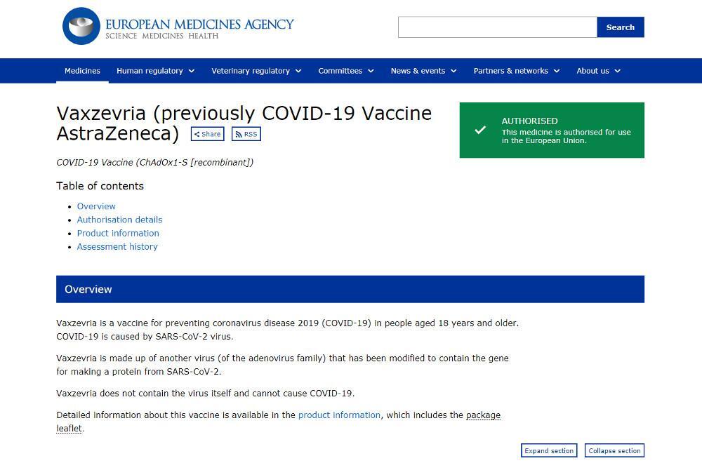 Το εμβόλιο είναι εγκεκριμένο στην Ευρώπη από τον Ευρωπαϊκό Οργανισμό Φαρμάκων (ΕΜΑ) και από τις 26 Μαρτίου ονομάζεται πλέον Vaxzevria.
