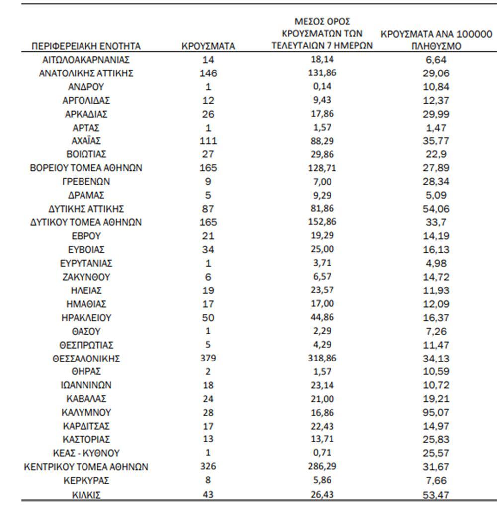 Με βάση τα επιβεβαιωμένα κρούσματα των τελευταίων 7 ημερών, 99 θεωρούνται σχετιζόμενα με ταξίδι από το εξωτερικό και 2.978 είναι σχετιζόμενα με ήδη γνωστό κρούσμα.