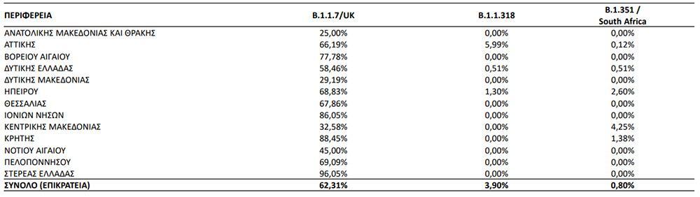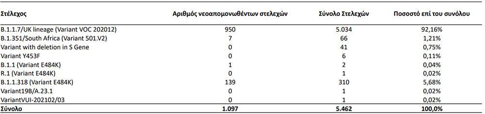 Εκ των 957 δειγμάτων με στελέχη μεταλλάξεων ειδικού ενδιαφέροντος, τα 950 αφορούσαν τη μετάλλαξη Β.1.1.7/UK lineage (Variant VOC_202012) και 7 αφορούσαν τη μετάλλαξη B.1.351/South Africa (Variant 501.V2), ενώ από τα 140 δείγματα με στελέχη VUI, τα 139 αφορούσαν το στέλεχος B.1.1.318 (Variant_E484K) και 1 αφορούσε το στέλεχος Β.1.1 (Variant_Ε484Κ).