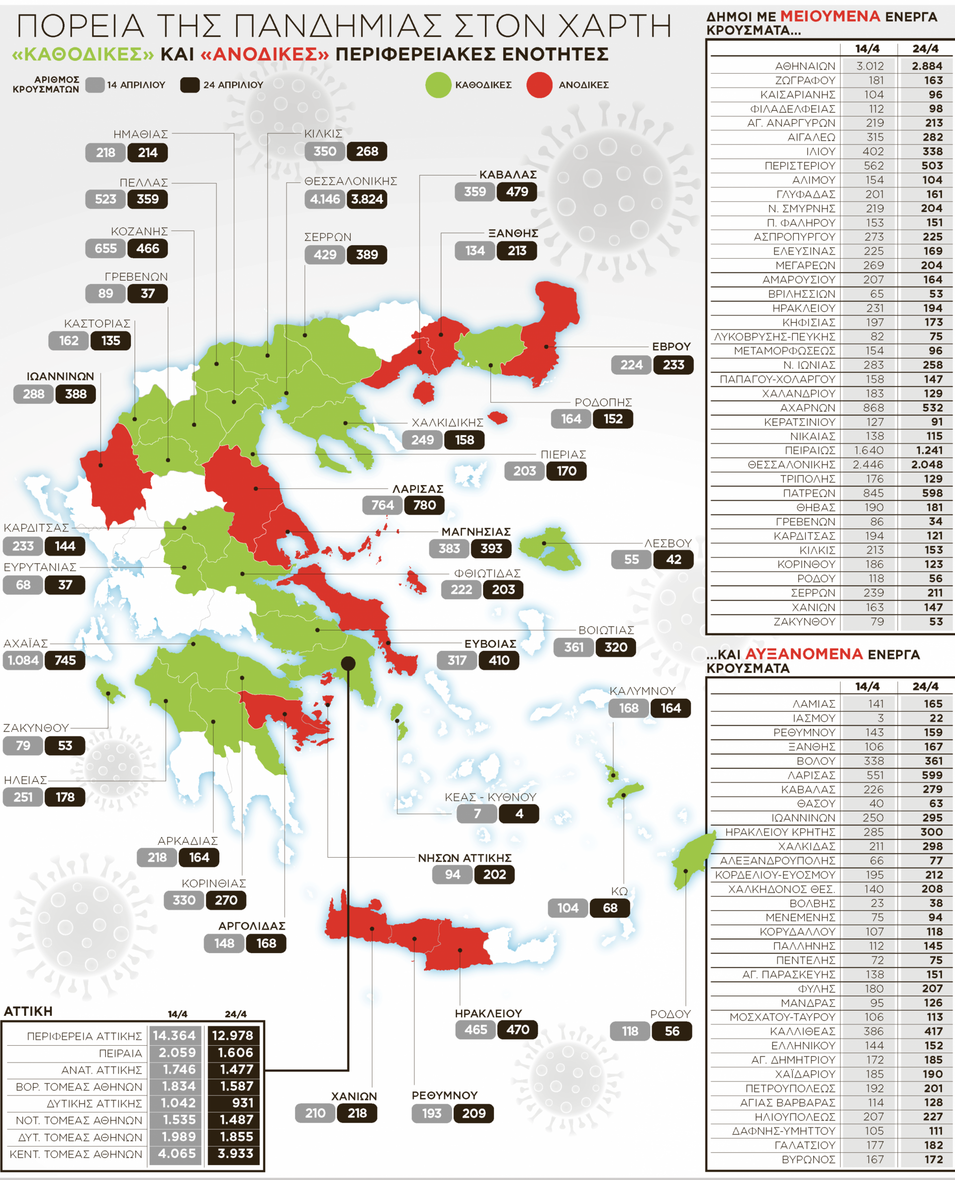 Μειώσεις ενεργών κρουσμάτων παρουσιάζουν κάποιοι σημαντικοί δήμοι στις 14 και 24 Απριλίου, όπως οι: Αθήνας 3.012 και 2.884, Ζωγράφου 181 και 163, Καισαριανής 104 και 96, Φιλαδέλφειας 112 και 98, Αγ. Αναργύρων 219 και 213, Αιγάλεω 315 και 282, Ιλίου 402 και 338, Περιστερίου 562 και 503, Αλίμου 154 και 104, Γλυφάδας 201 και 161, Ν. Σμύρνης 219 και 204, Π. Φαλήρου 153 και 151, Ασπροπύργου 273 και 225, Ελευσίνας 225 και 169, Μεγαρέων 269 και 204, Αμαρουσίου 207 και 164, Βριλησσίων 65 και 53, Ηρακλείου 231 και 194, Κηφισιάς 197 και 173, Λυκόβρυσης-Πεύκης 82 και 75, Μεταμορφώσεως 154 και 96, Ν. Ιωνίας 283 και 258, Παπάγου-Χολαργού 158 και 147, Χαλανδρίου 183 και 129, Αχαρνών 868 και 532, Κερατσινίου 127 και 91, Νίκαιας 138 και 115, Πειραιώς 1.640 και 1.241 ενεργά κρούσματα.