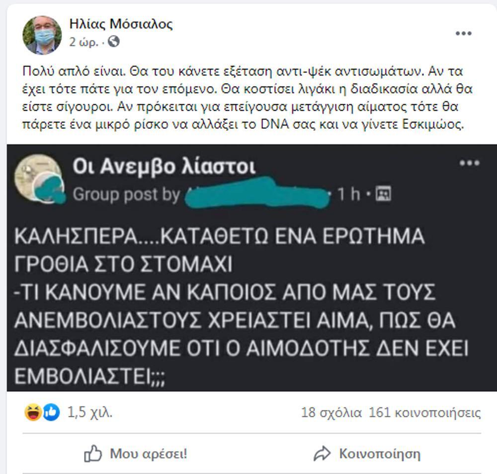 Με ανάρτησή του στο Facebook ο κ. Μόσιαλος σατιρίζει το ερώτημα από ένα μέλος μίας ομάδας με όνομα «Οι Ανεμβολίαστοι» σχετικά με το πώς θα διασφαλιστεί σε περίπτωση ανάγκης για μετάγγιση πως ο δότης αίματος δεν έχει εμβολιαστεί…