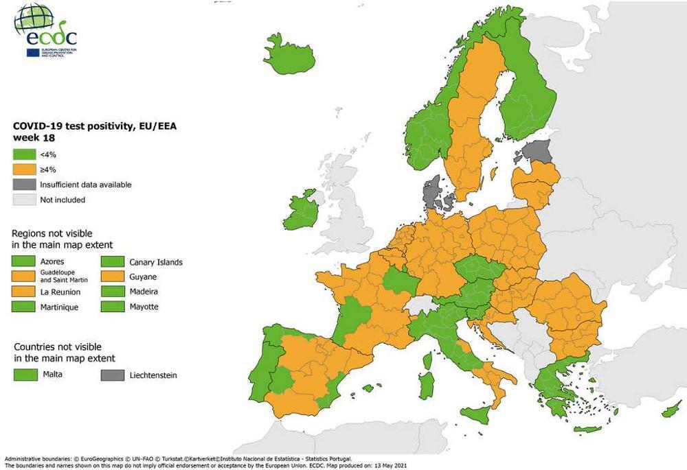 Σύμφωνα με τον σχετικό χάρτη για τον δείκτη θετικότητας, η Ελλάδα διατηρεί ποσοστό κάτω από το 4%.
