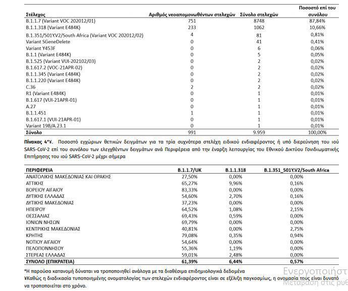 Από την έναρξη λειτουργίας του Εθνικού Δικτύου Γονιδιωματικής Επιτήρησης του ιού SARS-CoV-2 μέχρι σήμερα έχουν ελεγχθεί στην επικράτεια συνολικά 12.874 δείγματα από εγχώρια κρούσματα, εκ των οποίων τα τρία πιο συχνά στελέχη ειδικού ενδιαφέροντος ή υπό διερεύνηση που έχουν απομονωθεί είναι το Β.1.1.7/UK lineage (Variant VOC 202012/01), με ποσοστό 61,39%, ακολουθούμενο από το B.1.1.318 (Variant E484K) με ποσοστό 6,44% και το B.1.351/501Y.V2/South Africa (Variant VOC 202012/02) με ποσοστό 0,57% (Πίνακας 4).