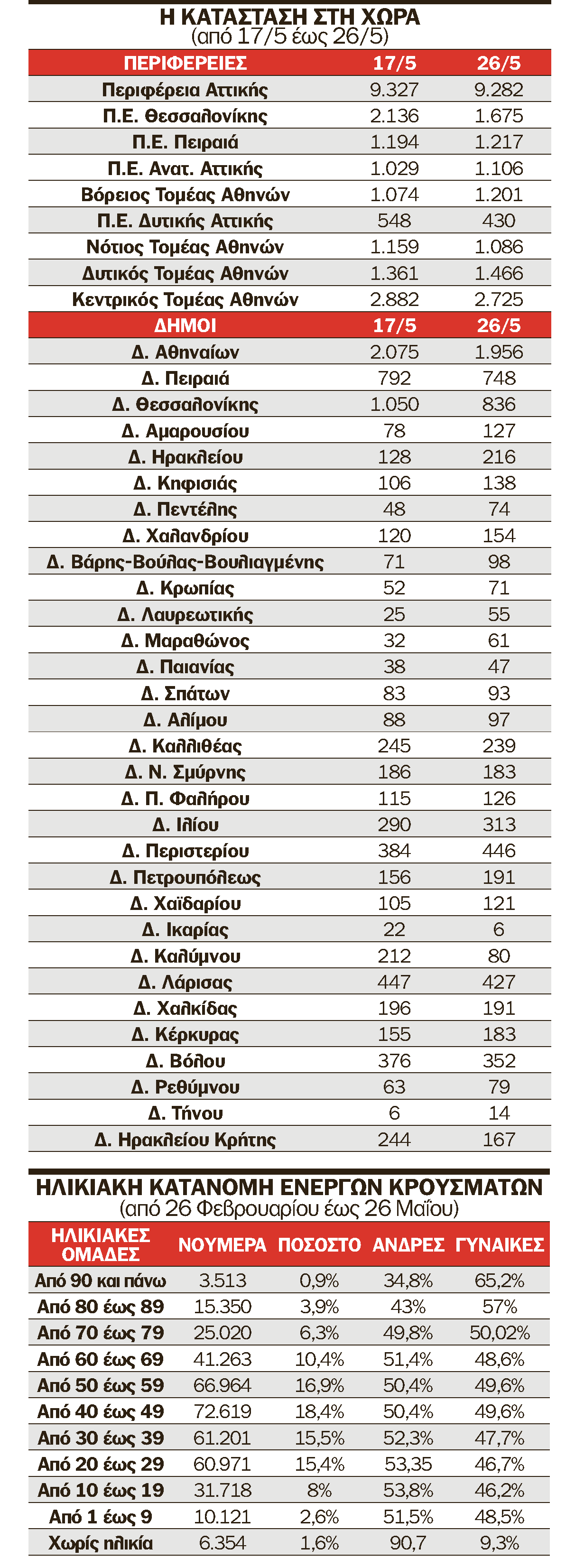 Αρκετοί δήμοι σε Αττική και επαρχία παρουσιάζουν σημαντικές μειώσεις και κάποιοι άλλοι οριακές ή μεγαλύτερες αυξήσεις. Το χρονικό διάστημα από 17 έως 26 Μαΐου, ο Δήμος Αθηναίων έπεσε από τα 2.075 ενεργά κρούσματα στα 1.956, αυτός του Πειραιά από 792 στα 748, της Θεσσαλονίκης από 1.050 στα 836 και της Καλλιθέας από 245 στα 239. Αύξηση το ίδιο χρονικό διάστημα παρουσιάζουν οι Δήμοι Αμαρουσίου από 78 στα 127, Ηρακλείου από 128 στα 216, Κηφισιάς από 106 στα 216, Χαλανδρίου από 120 στα 154, Βάρης-Βούλας-Βουλιαγμένης από 71 στα 98, Αλίμου από 88 στα 97, Ιλίου από 290 στα 313, Περιστερίου από 384 στα 446, Πετρουπόλεως από 156 στα 191, Χαϊδαρίου από 105 στα 121.