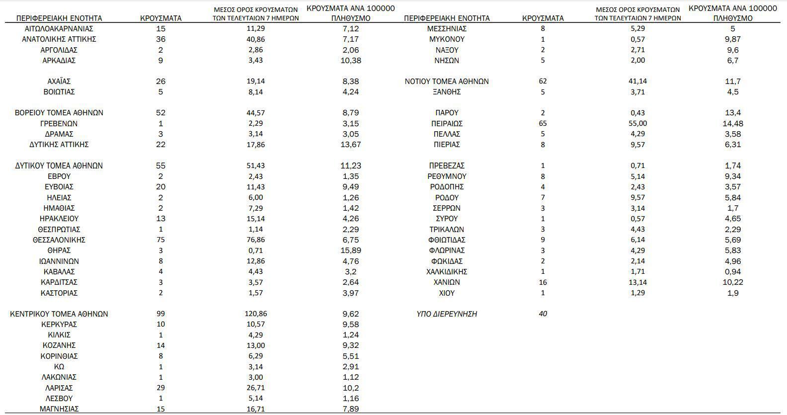 Αναλυτικότερα τα κρούσματα στις περιφερειακές ενότητες που ανήκουν στην Αττική: